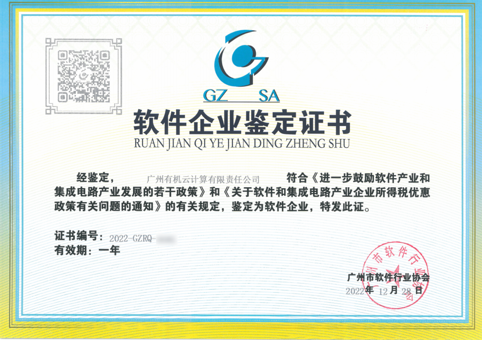 近日,由广州市软件行业协会认定,经过严格的审核评估流程,依据国家《软件企业评估标准》和《软件产品评估标准》的相关规定,有机云及其产品通过多重审核,获评“软件企业”。