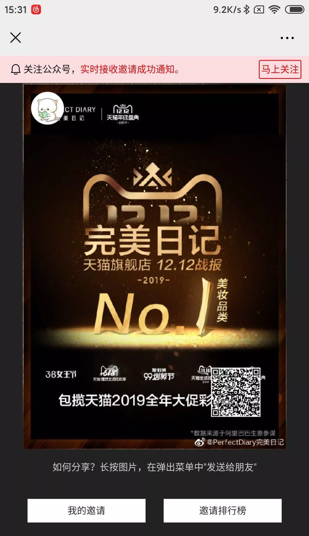 还未关注公众号的用户,在生成专属的裂变海报时会在海报上方有专门的提示,引导用户关注。从而这场裂变活动也能给公众号带来涨粉的作用