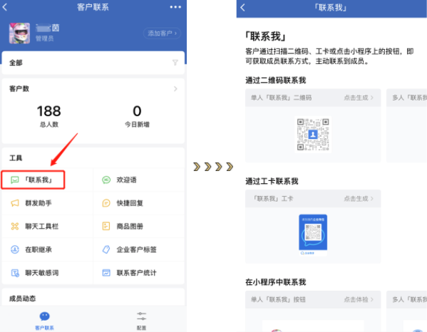 - 使用「我」->「对外名片」的二维码也能通过这种方式添加,但「联系我」二维码是企业微信专门提供给服务人员的,它是添加客户最高效的方式,使用「联系我」二维码,客户添加时无需经过确认自动成为好友。